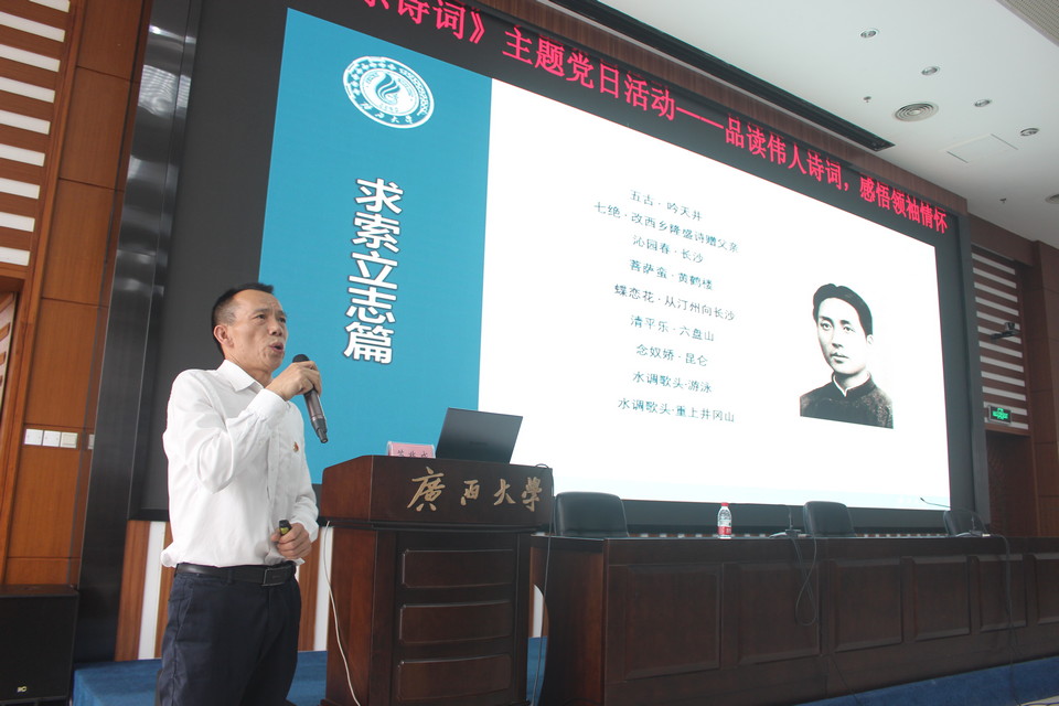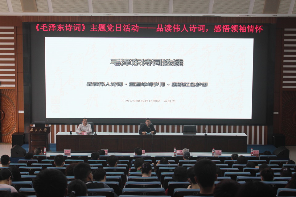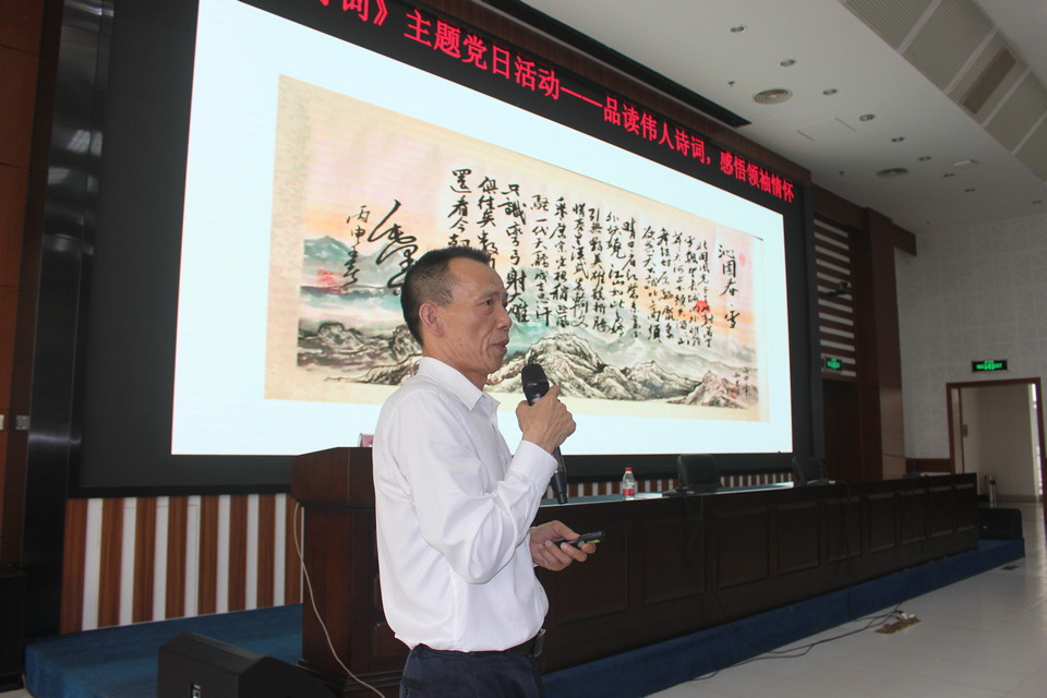 活动邀请太阳成tyc33455cc经理苏兆成做导读,引领党员从求索立志、逐梦奋斗两方面去理解和赏析毛泽东从1906年起至1969年所作的数十首诗词,通过品读领袖诗词,重温峥嵘岁月,庚续红色梦想。