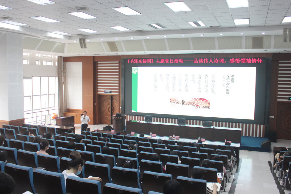 2022年3月15日下午,校工会、财务处、体育公司、太阳成tyc33455cc、图书馆、档案馆、员工工作办公室党支部在图书馆六楼报告厅联合举办《毛泽东诗词选读》主题党日活动。