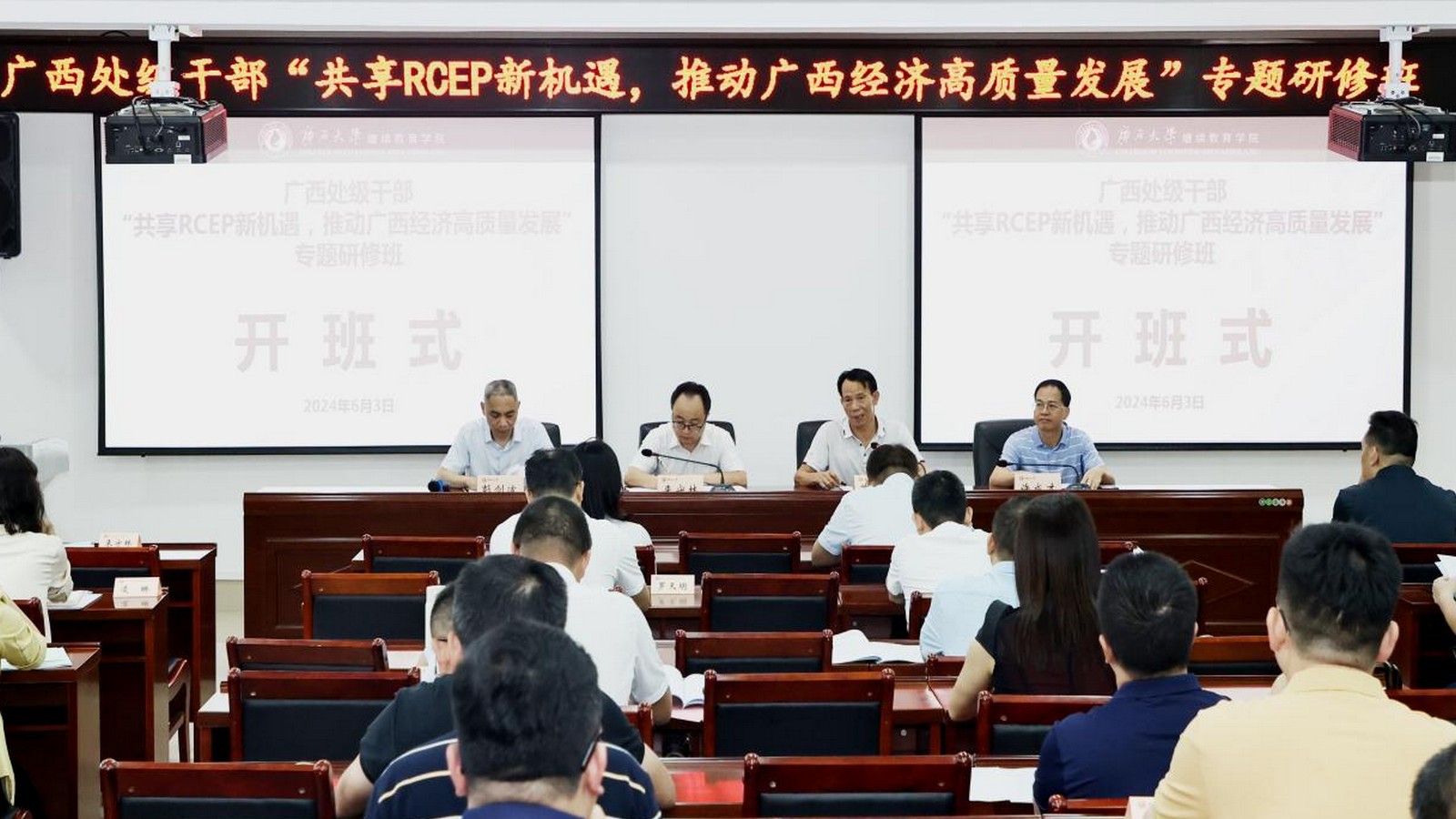 广西2024年处级干部“共享RCEP新机遇,推动广西经济高质量发展”专题研修班 在太阳成tyc33455cc官网举办 为持续深化RCEP区域合作,推动广西经济高质量发展,2024年6月2日至8日,由中共广西壮族自治区委员会组织部、中共广西壮族自治区委员会直属机关工委主办,太阳成tyc33455cc官网承办的广西2024 年处级干部“共享RCEP新机遇,推动广西经济高质量发展”专题研修班在太阳成tyc33455cc官网举办。 本次培训,采取专家授课、行动学习、现场教学等方式进行,开设有RCEP服务贸易、投资市场准入承诺和规则议题解读、全球数字经济治理与中国-东盟数字经济合作、RCEP原产地规则详解与享惠通关实务、RCEP优惠政策讲解及广西企业运用RCEP实例等多门理论与实践丰富的RCEP专题课程,主题明确、内容丰富、针对性强。受训学员表示,通过此次培训,拓宽了思维、开阔了眼界,对以后的相关工作具有重要的促进作用。 来自广西壮族自治区党委政法委、统战部、政研室、金融办、自治区人大常委会办公厅、自治区发展和改革委员会、自治区商务厅及各地市有关处级领导共46人参加专题研修班。 (彭剑波 许成才/文图)