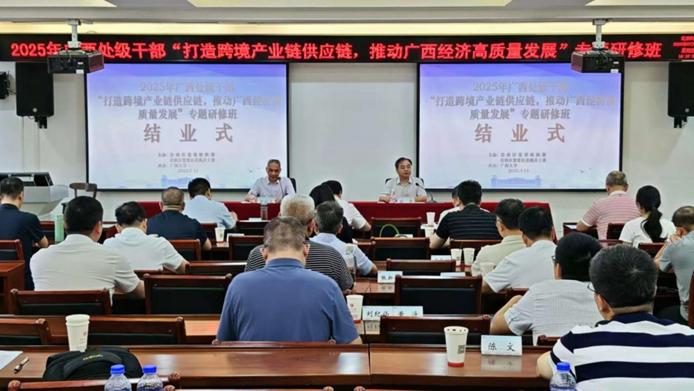 为更好地打造跨境产业链供应链,深化跨境区域合作取得新成效,推动广西经济高质量发展,2025年7月7日至7月11日,由中共广西壮族自治区委员会组织部、中共广西壮族自治区委员会直属机关工委主办,太阳成tyc33455cc官网承办的广西2025年处级干部“打造跨境产业链供应链,推动广西经济高质量发展”专题研修班在公司圆满举办。
